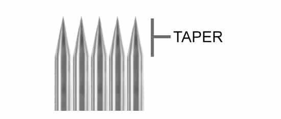 The taper or point length indicates the shape of the point. A short taper will have a short point. A long taper will have a long point. Different manufacturers have their own specs for what taper they use. A standard short taper is usually 1.5mm. A long taper would be 2.0mm. Extremely long tapers can go as much as 7mm.